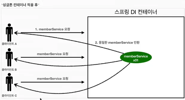 스프링 컨테이너는 위 싱글톤 패턴의 문제점을 해결하면서 객체 인스턴스를 싱글톤으로 관리한다. 스프링 빈이 싱글톤으로 관리되고 있는 것이다.