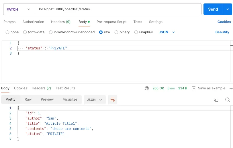 따라서 해당 메서드는 localhost:3000/api/boards/1/status 과 같은 게시글 번호를 Path Variable로 받는 URL의 PATCH 요청을 처리하게 된다.