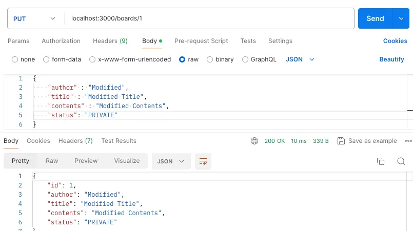 따라서 해당 메서드는 localhost:3000/api/boards/1 과 같은 게시글 번호를 Path Variable로, 요청 바디의 값들은 DTO 객체로 변환되어 받는 URL의 PUT 요청을 처리하게 된다.