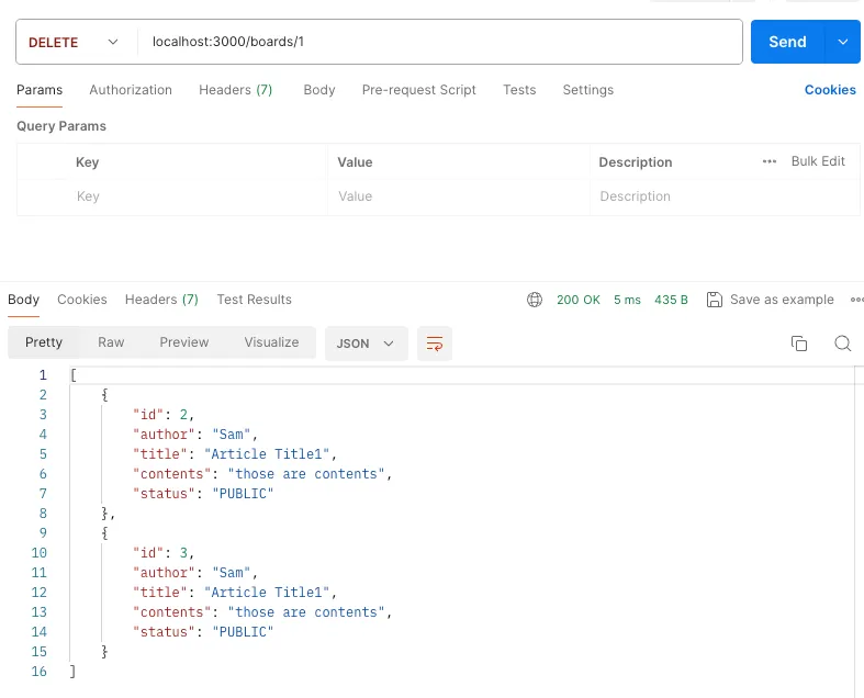 따라서 해당 메서드는 http://localhost:3000/api/boards/1 과 같은 게시글 번호를 Path Variable로 받는 URL의 DELETE 요청을 처리하게 된다.