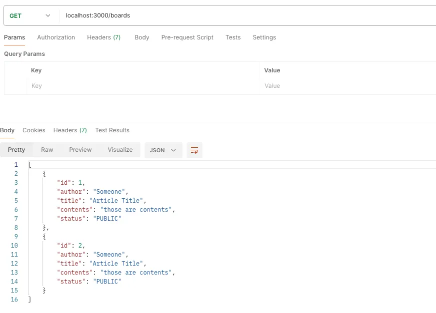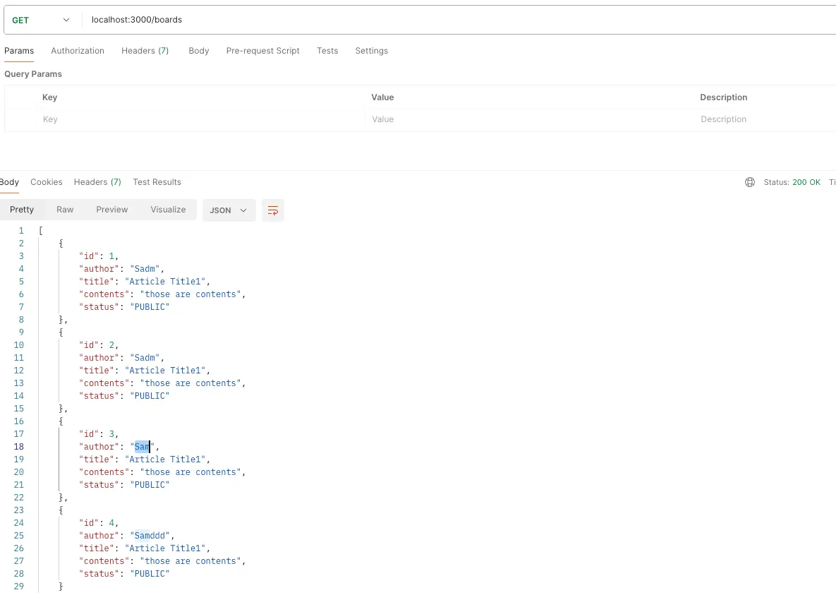 요청에대한 반환(응답)은 boardsService의 getBoardByAuthor(author) 메서드에 경로 변수로 받아온 author 값을 전달하며 호출하여 그 반환 데이터를 응답하게 된다. (→ 결과, 저장된 board[] 배열이 반환 되어 클라이언트로 응답하게 된다.)