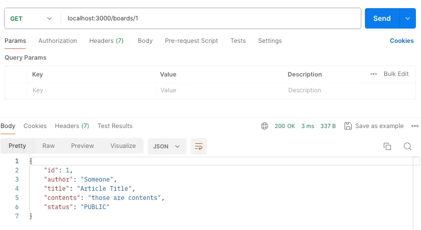 Board 클래스 타입의 board 변수에는 id, author, title, contents, status가 할당되어 게시글 객체가 생성된다.