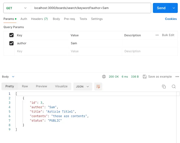 따라서 해당 메서드는 http://localhost:3000/api/boards/search/keyword?author=Sam 과 같은 게시글 작성자를 쿼리 스트링으로 받는 URL의 GET 요청을 처리하게 된다.