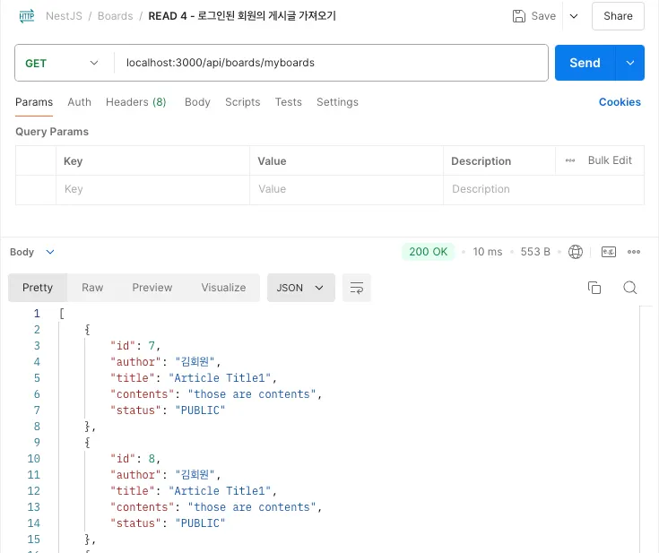 이에 따라 특정 게시글의 조회 메서드가 사용되는 기능(특정 게시글 수정, 삭제 등)들에 기본적으로 게시글의 user 정보에 접근 할 수 있는 상태가 되었다.