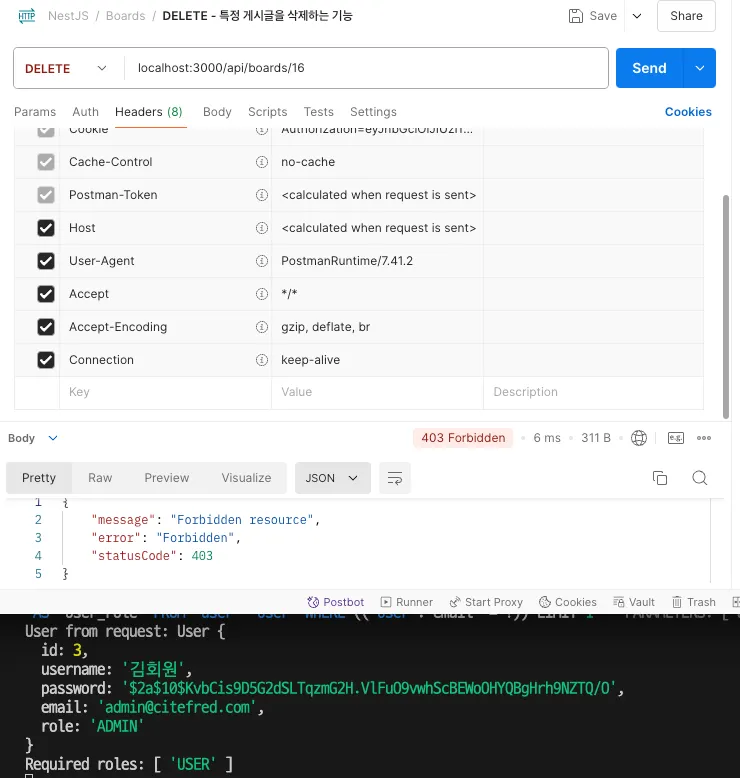이는 기획에 따라 다르지만 게시글 삭제 권한은 해당 유저에게만 있어야 된다고 생각이 되었음
