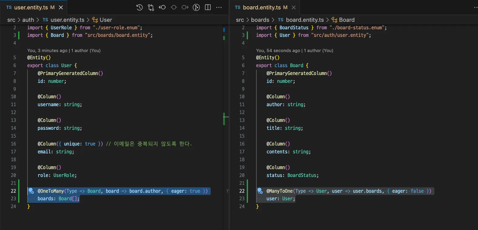 왼쪽을 User, 오른쪽을 Board로 두었을 때 블록 처리한 것 처럼 서로를 참조하는 필드가 추가되어야 한다.